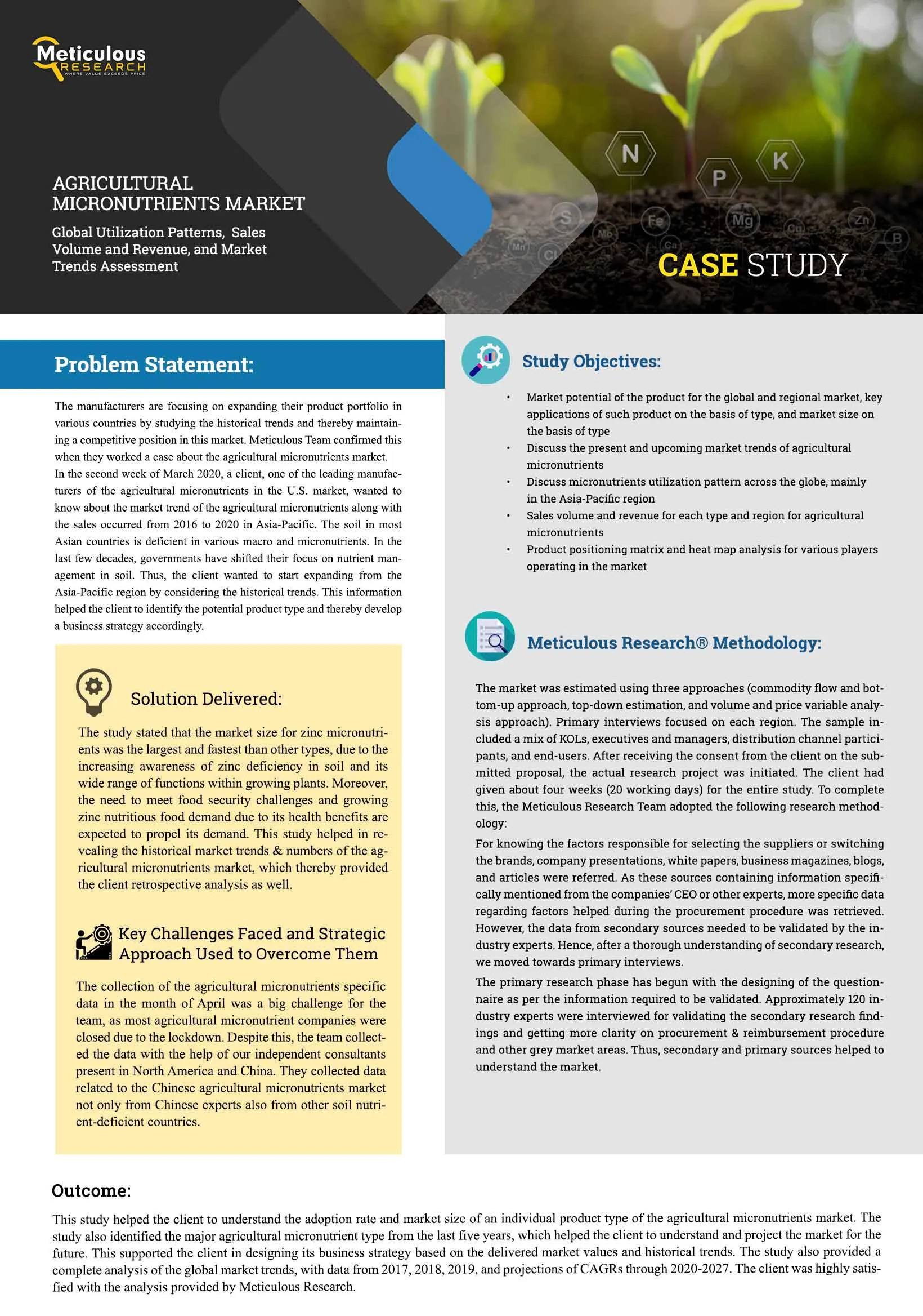 In the second week of March 2020, a client, one of the leading manufacturers of the agricultural micronutrients in the U.S. market, wanted to know about the market trend of the agricultural micronutrients along with the sales occurred from 2016 to 2020 in Asia-Pacific. The soil in most Asian countries is deficient in various macro and micronutrients. In the last few decades, governments have shifted their focus on nutrient management in soil. Thus, the client wanted to start expanding from the Asia-Pacific region by considering the historical trends. This information helped the client to identify the potential product type and thereby develop a business strategy accordingly.