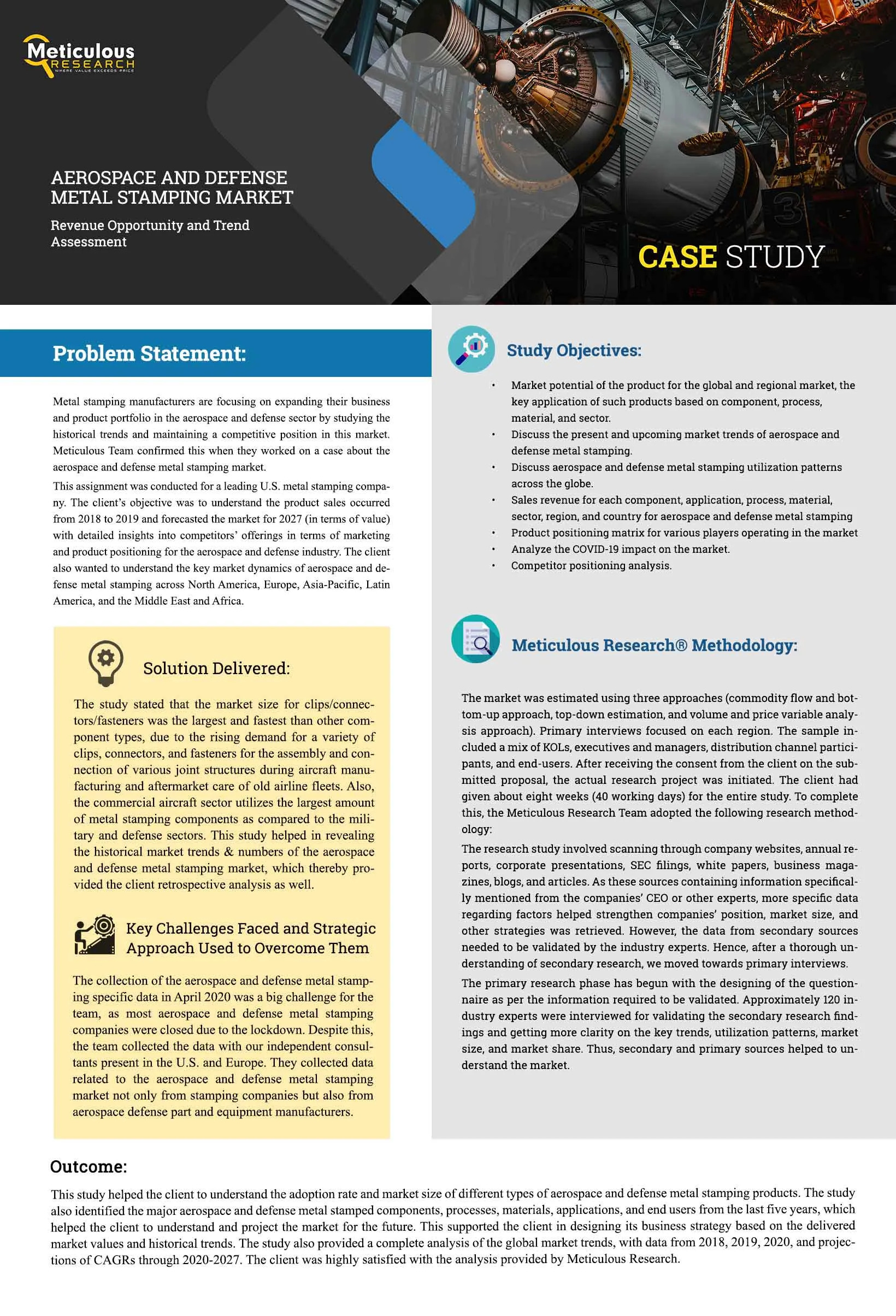 Metal stamping manufacturers are focusing on expanding their business and product portfolio in the aerospace and defense sector by studying the historical trends and maintaining a competitive position in this market. Meticulous Team confirmed this when they worked on a case about the aerospace and defense metal stamping market.