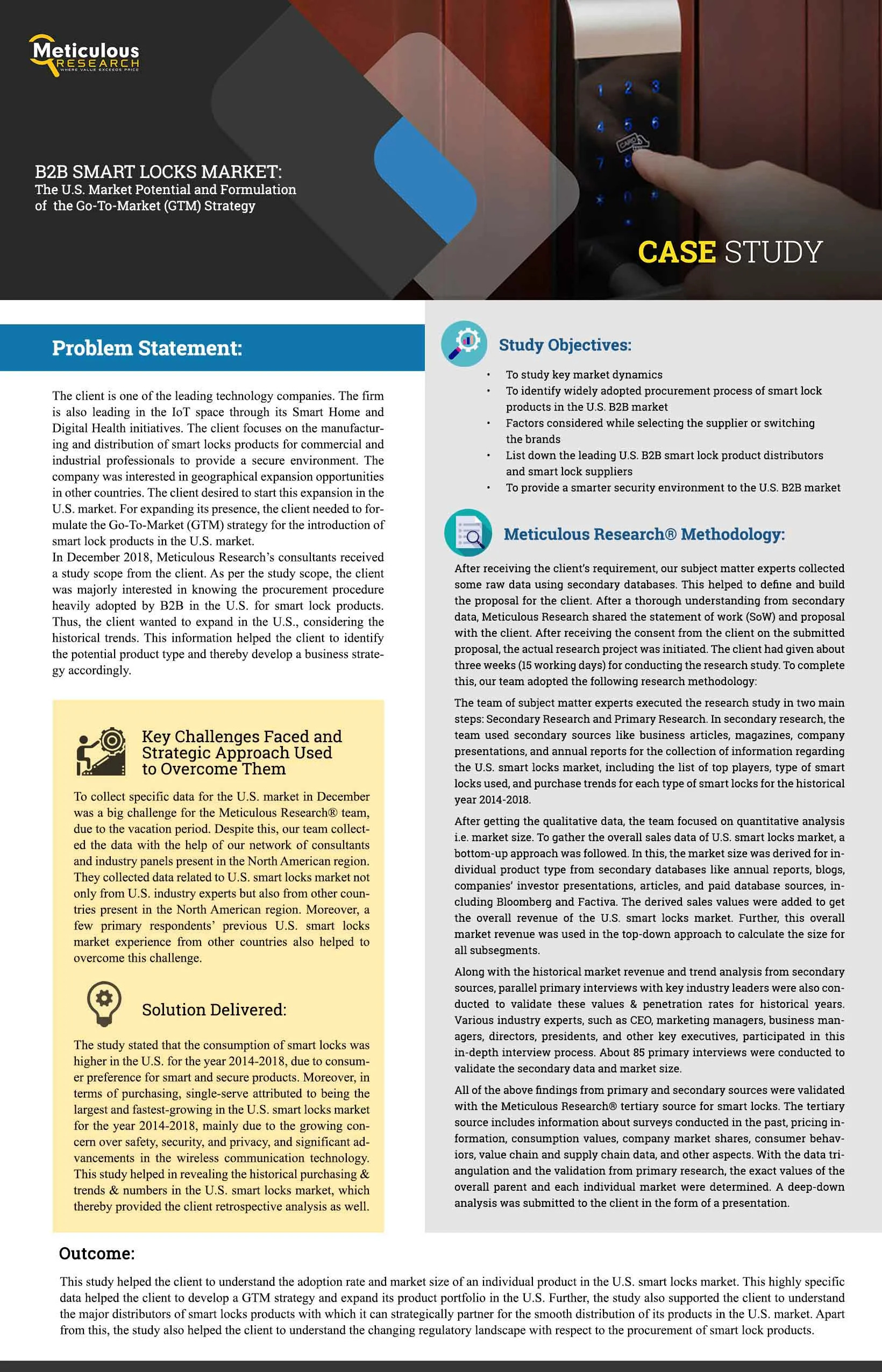 In December 2018, Meticulous Research’s consultants received a study scope from the client. As per the study scope, the client was majorly interested in knowing the procurement procedure heavily adopted by B2B in the U.S. for smart lock products. Thus, the client wanted to expand in the U.S., considering the historical trends. This information helped the client to identify the potential product type and thereby develop a business strategy accordingly.